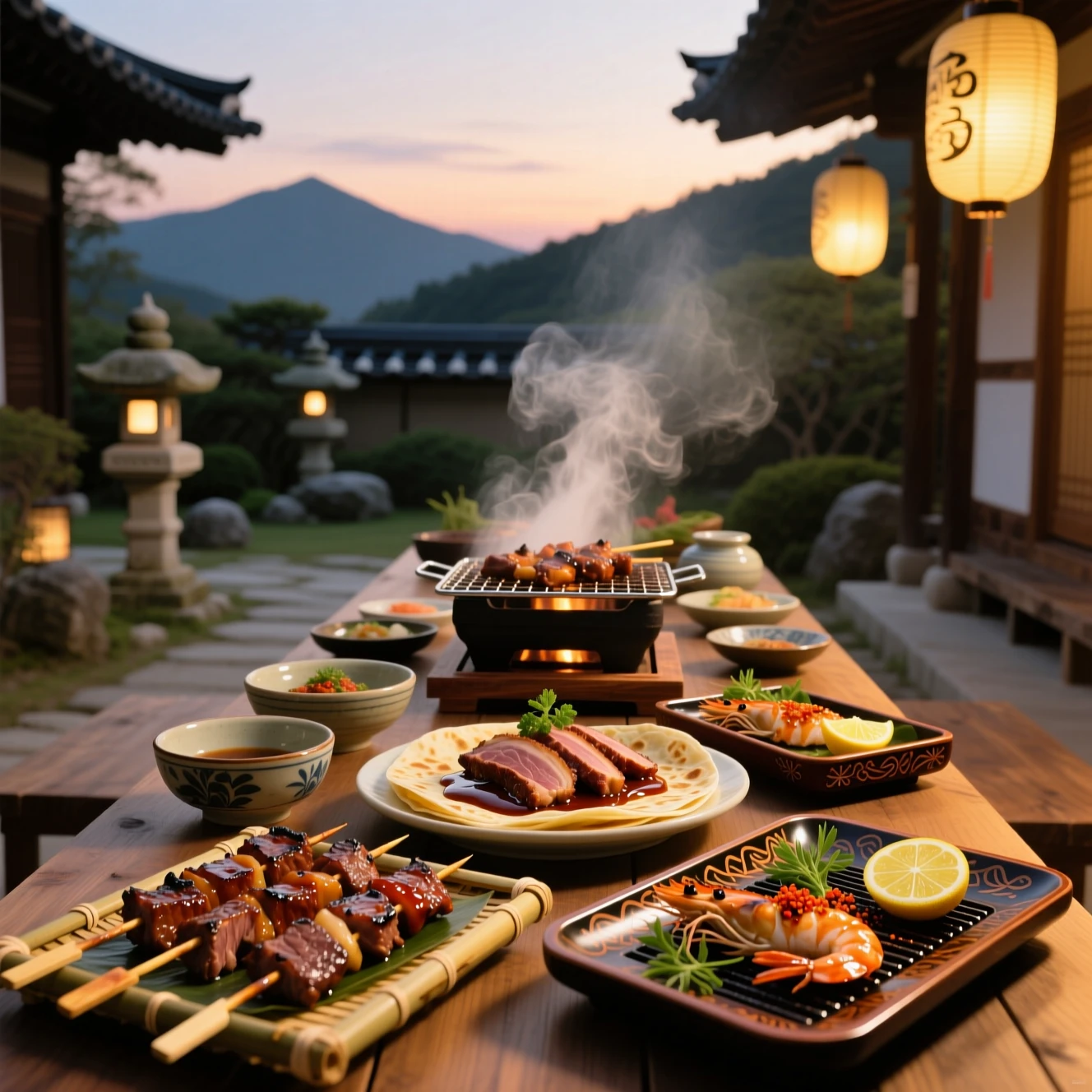 - Подготовьте три зоны: корейскую (маринованное мясо + банчаны), китайскую (шашлычки с зирой), японскую (вагю + tare).