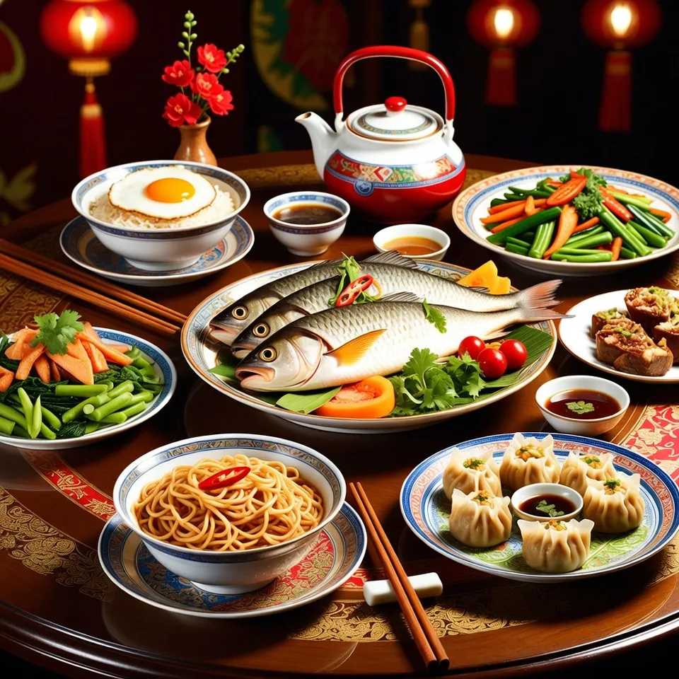 - Рыба целиком — обязательное блюдо, символизирующее изобилие. Название «рыба» (юй) звучит как «излишек».