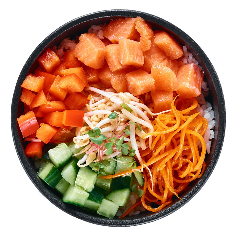 Гавайское блюдо с маринованным лососем, свежим огурцом, болгарским перцем, пикантной морковью, острым соусом манго-сальса, кунжутом и проростками маш. Основу можно выбрать на свой вкус ( рис, булгур или лёгкий салатный микс) Вес блюда зависит от выбранной основы, на сайте указан минимальный вес на салатном миксе.