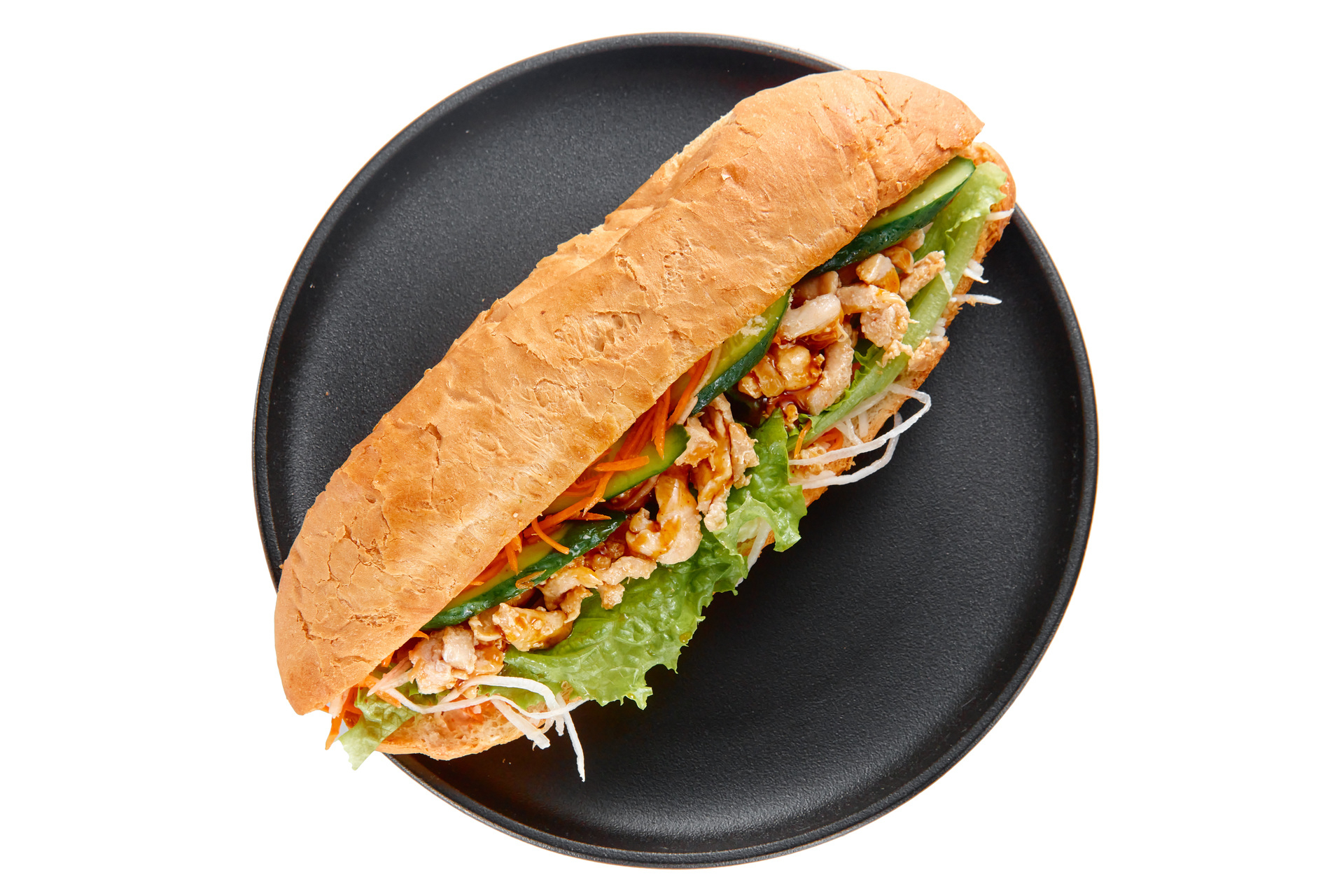 Вьетнамский сендвич на багете (35 см) с начинкой из куриного филе, свежих листьев салата и зелени, свежего огурца, пикантной моркови и дайкона . Соус мацахиро и крем васаби завершают вкус.
