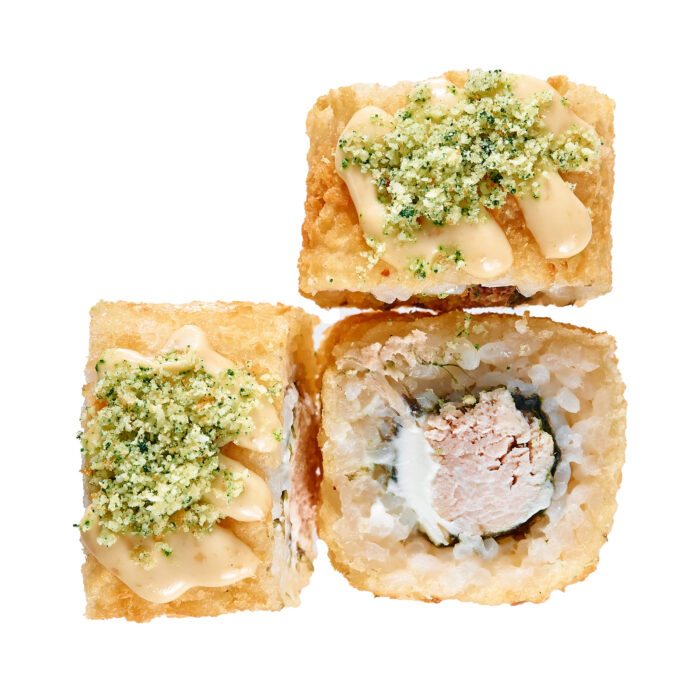 Выбор начинки: куриное филе, лосось или креветки даёт возможность разнообразить блюдо. Ролл украшается черри и листом салата и сырным декором и подаётся с комплектом имбиря, васаби и соевого соуса. В порции 8 штук