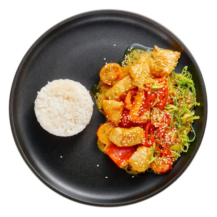 Сочетание куриного филе и болгарского перца в соусе карри на основе кокосового молока с помидорками черри, зелёным луком порей ,перчиком чили и заправленным рисом .Блюдо украшается кунжутом и луком порей.