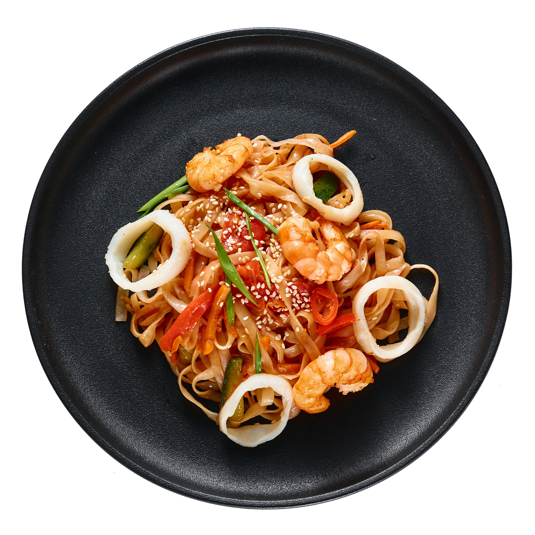 сочетание лапши, креветок, кальмара ,свежего огурца, свежей моркови, маринованного имбиря и фирменного соуса. Приготовлено с добавлением чесночного масла, перчика чили, кунжута и зелёного лука.