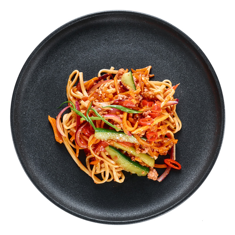 сочетание лапши, куриного филе ,свежего огурца, свежей моркови, маринованного имбиря и фирменного соуса. Приготовлено с добавлением чесночного масла, перчика чили, кунжута и зелёного лука.