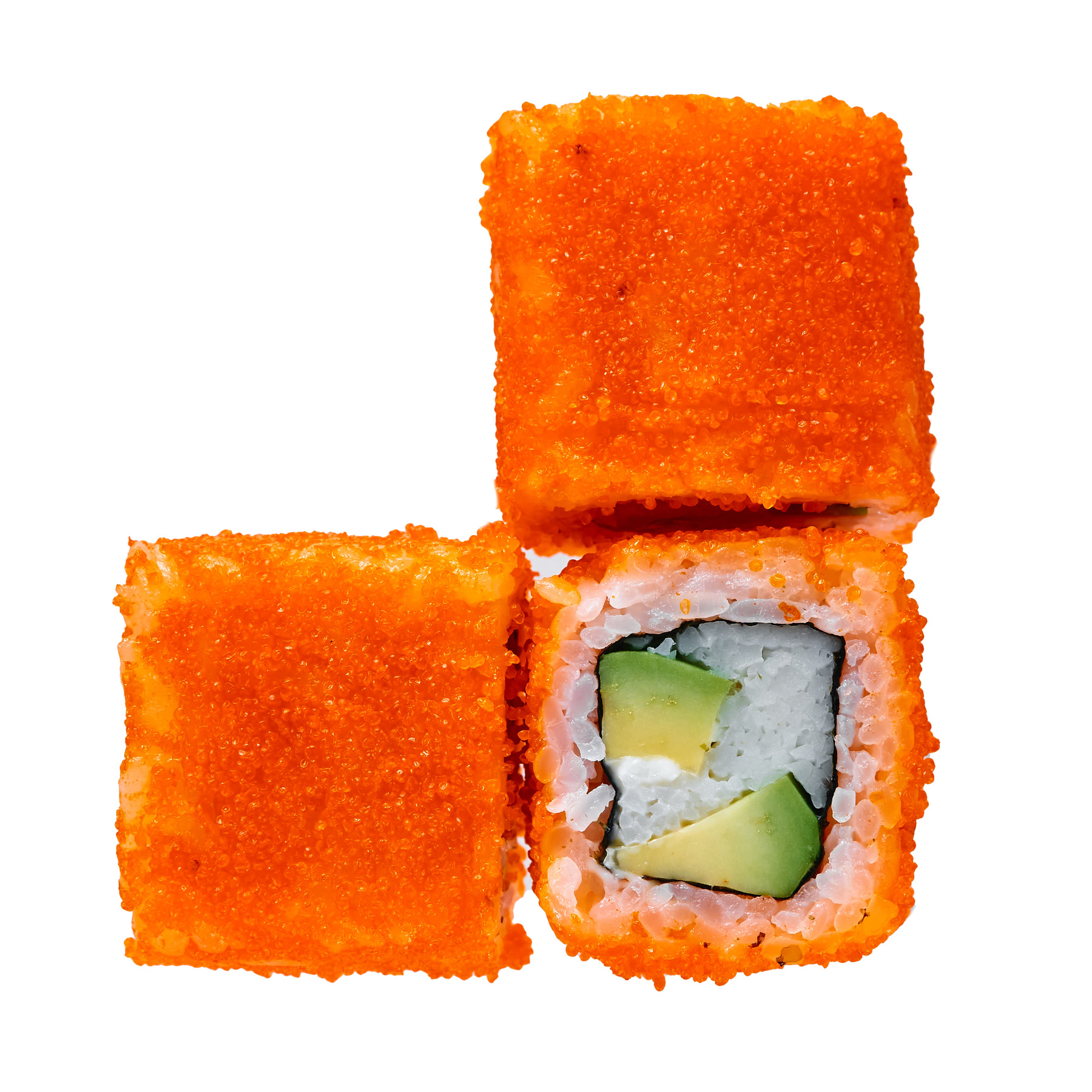 Роллы с мясом краба (сурими), свежим огурцом или авокадо на выбор, легким соусом из майонеза, заправленным рисом, листом нори и икрой тобика. В дополнении к блюду васаби, соевый соус и имбирь. 8 шт в порции