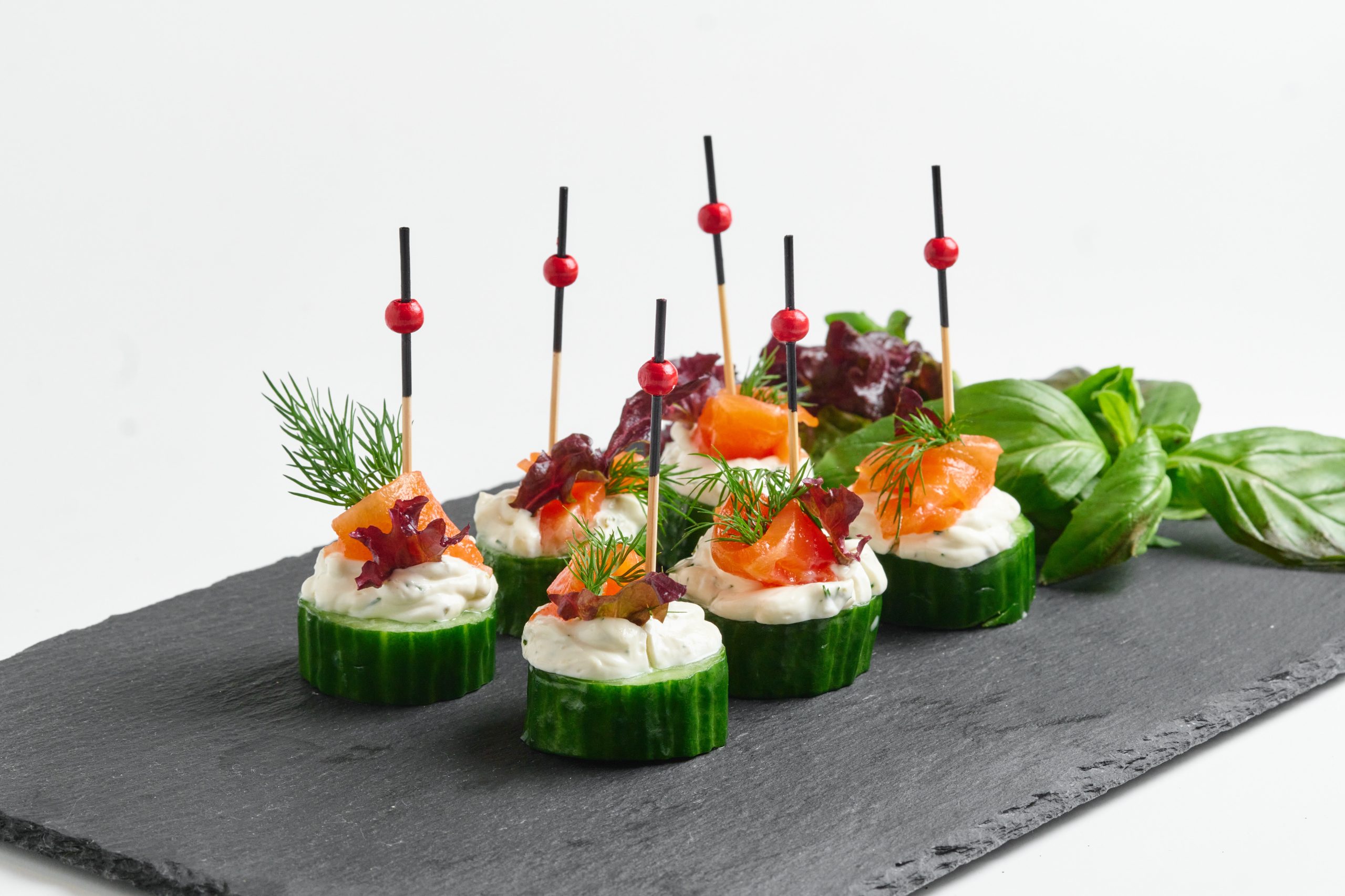 Канапе с лососем, огурцом, сливочным сыром и листом салата. Комплект 6 штук.
