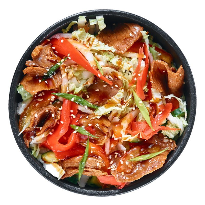 Нежные ломтики говядины сочетаются с хрустящей пекинской капустой, болгарским перцем , свежим огурцом, маринованным имбирём и кунжутом. Заправлен салат фирменным соусом на основе соуса терияки с добавлением чесночного масла.