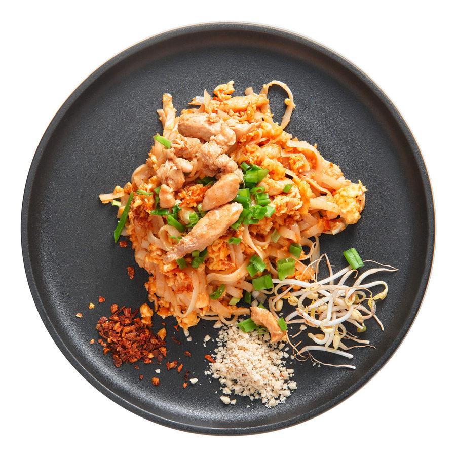 Традиционное тайское блюдо с куриным филе, обжаренным на воке, рисовой лапшой, свежими проростками маш, зелёным луком и паприкой. Каждая порция украшена дроблёным арахисом для приятного хруста, а пикантный соус Пад Тай добавляет блюду сладко-кислую нотку. Подаётся с долькой лайма.