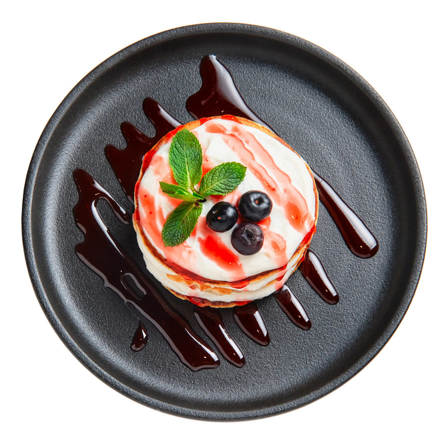 Воздушные панкейки со сливочным кремом, ягодным топпингом, голубикой. Украшается свежей мятой и посыпается сахарной пудрой.
