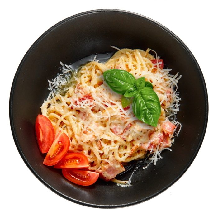 Паста спагетти с насыщенным сливочно-чесночным соусом, обжаренным беконом, томатами черри , яичным желтком и сыром пармезан.