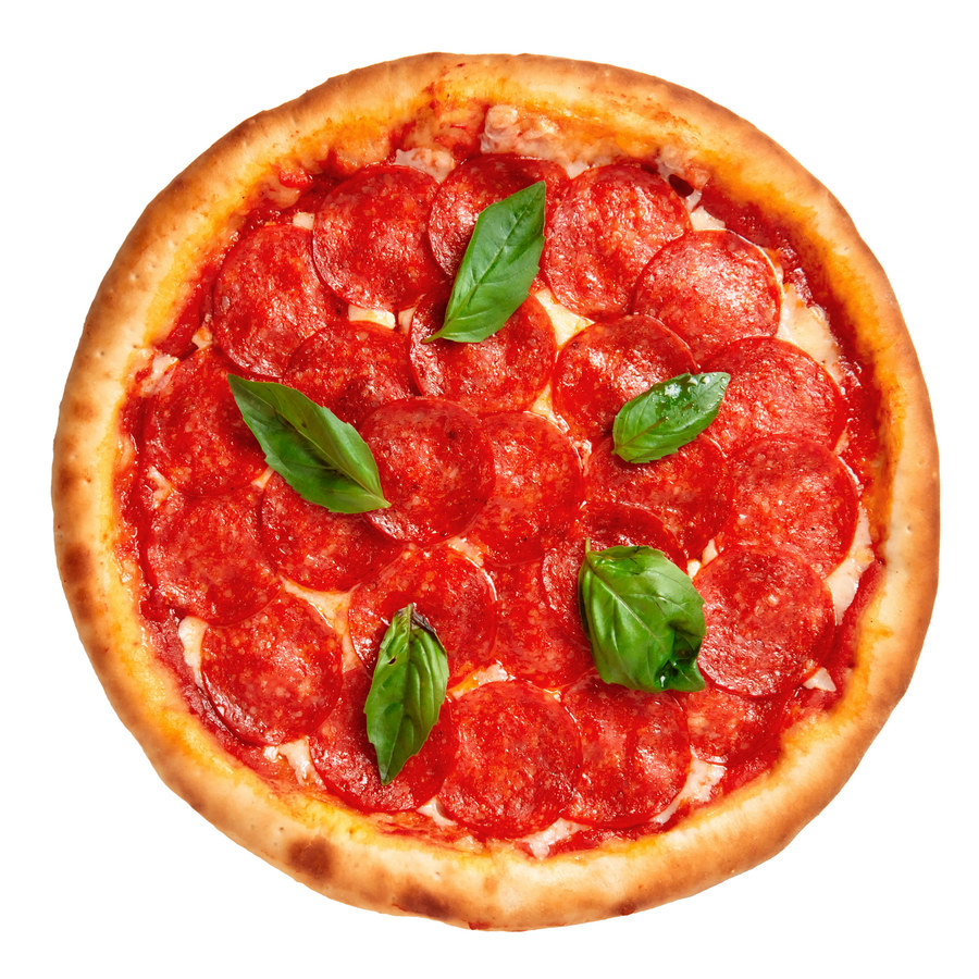 Пицца на тонком тесте с томатным соусом мутти, колбаской пеперони и всё под сыром моцарелла.