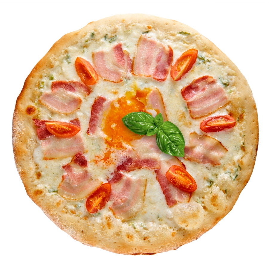 Пицца на тонком тесте с соусом карбонара, сыром моцарелла , беконом , сладкими помидорками черри и яичным желтком . Завершают блюдо свежие листья базилика , придавая блюду изысканный аромат.