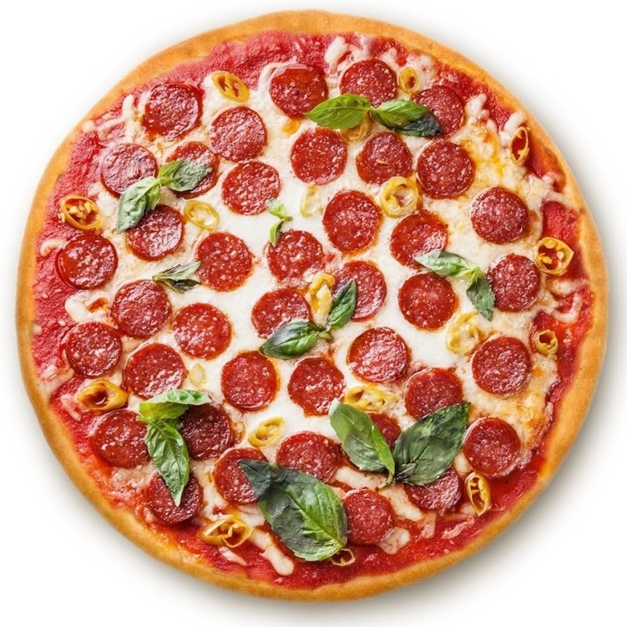 Пицца на тонком тесте с томатным соусом , колбасками пеперони, сыром моцарелла и базиликом на украшение.