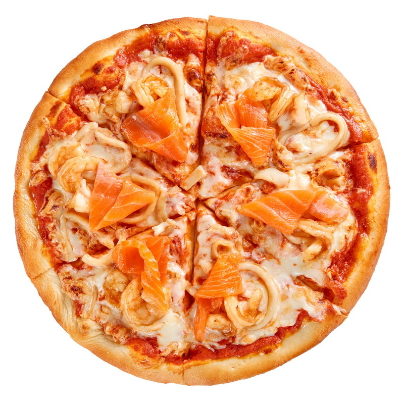 Пицца на тонком тесте с соусом Том Ям, в сочетании с сочным лососем, кальмаром, креветками, томатами черри и сыром моцарелла. На тонком тесте, которое идеально подчеркивает богатую начинку, эта пицца становится настоящей гастрономической находкой.
