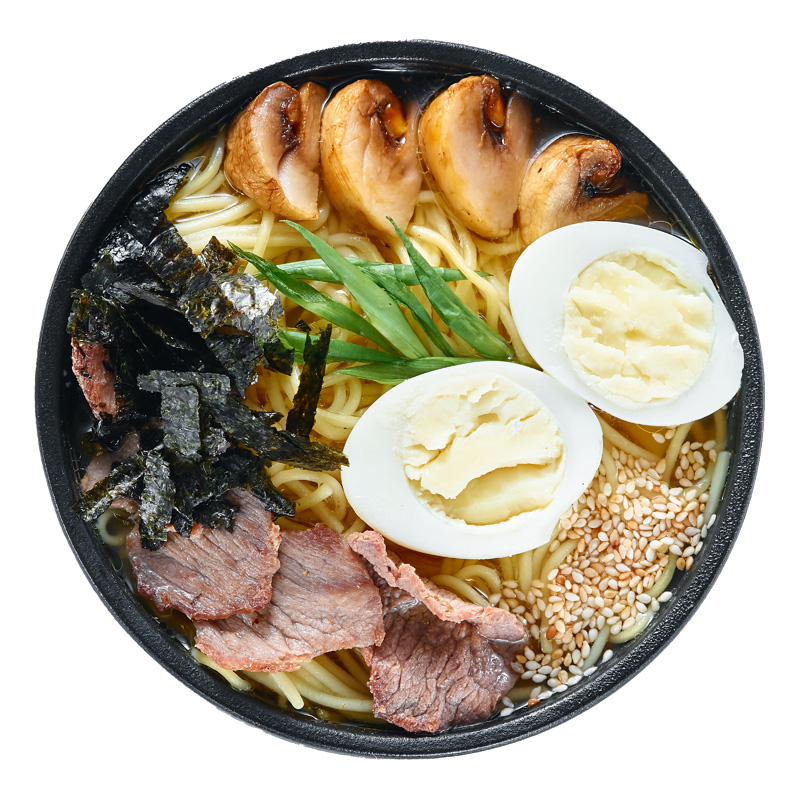 Японский суп на основе насыщенного говяжьего бульона, с яичной лапшой, говядиной, шампиньонами, шпинатом и маринованным яйцом и кунжутом. Подаётся с листом нори, зелёным луком и паровыми булочками. Вес блюда прописан с учётом всех ингридиентов и булочек.