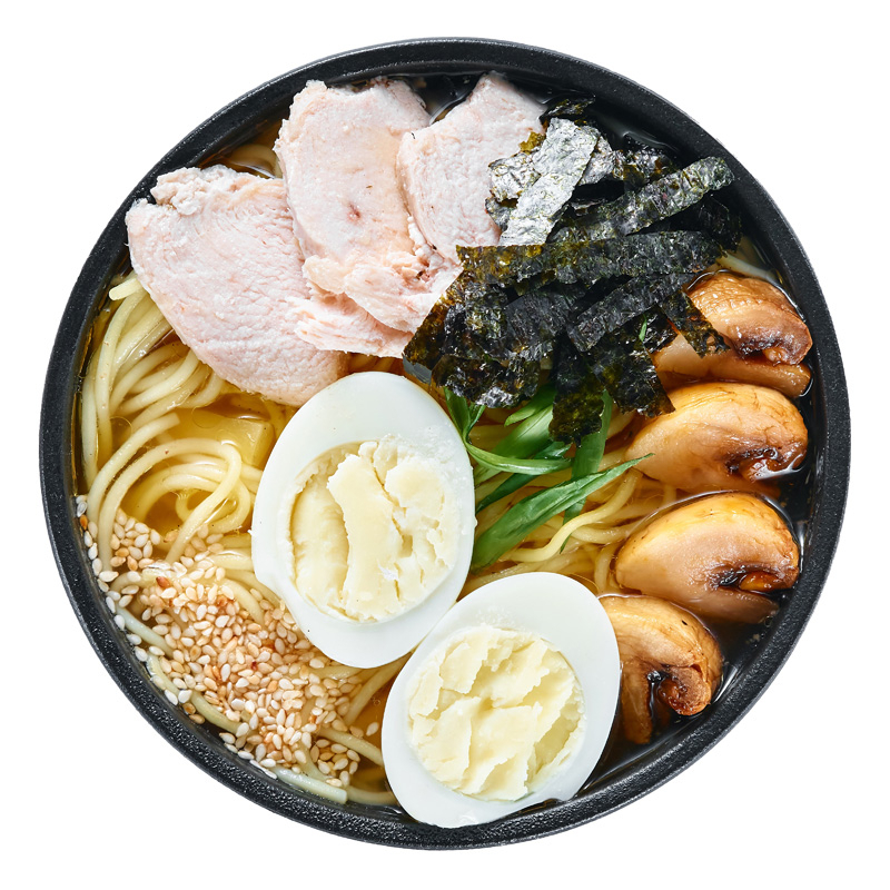Японский суп на основе говяжьего бульона с куриным филе, шампиньонами, шпинатом, маринованным яйцом и кунжутом. Подаётся с листом нори, зелёным луком и паровыми булочками. Вес блюда прописан с учётом всех ингридиентов и булочек.