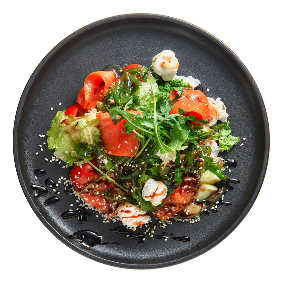 Лёгкий салат на основе салатного микса из рукколы, листа салата и пекинской капусты, с форелью малой соли, помидорками черри, свежим огурцом, водорослями чука и сливочно творожным сыром.