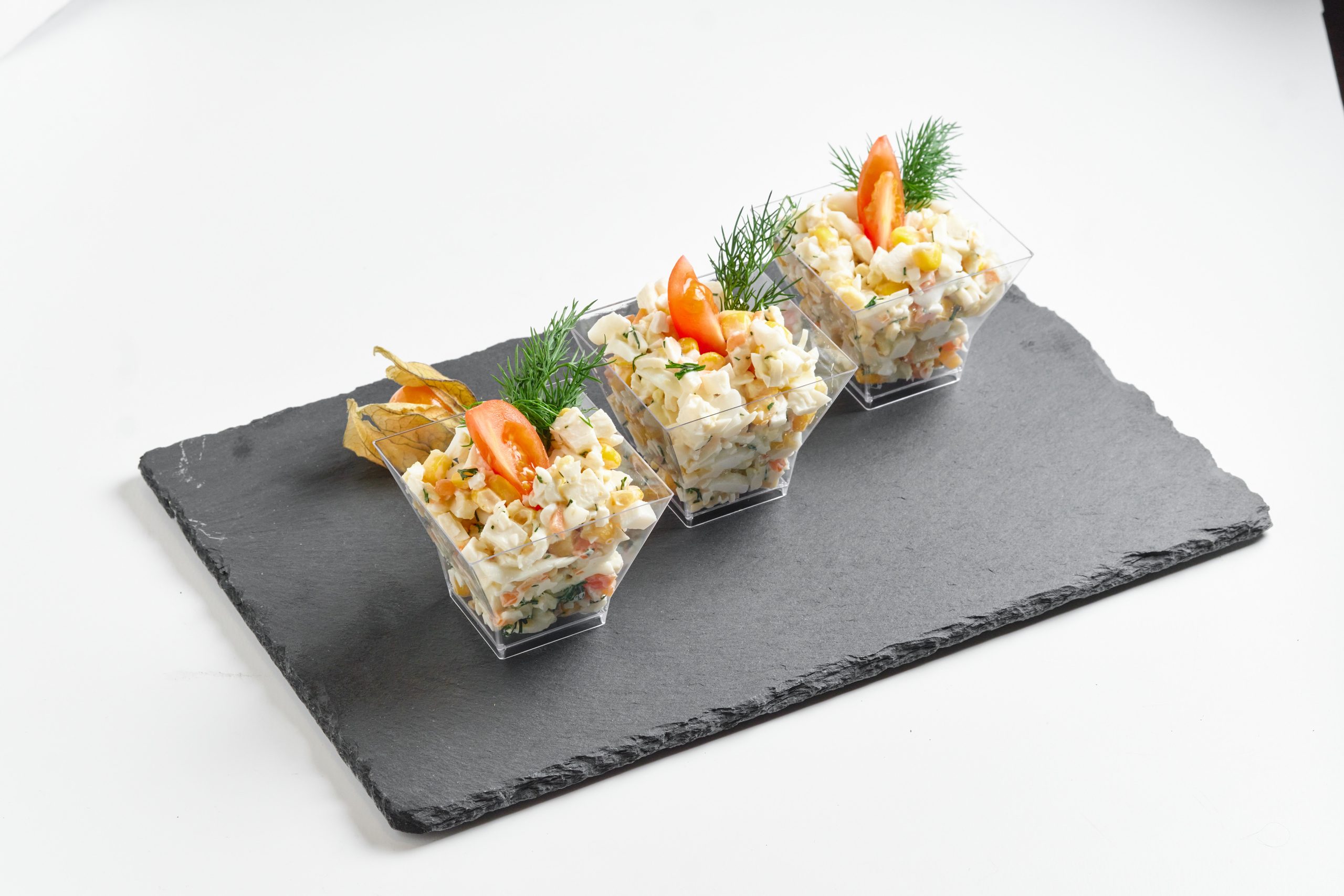 Салат с мясом краба сурими, консервированной кукурузой, отварной морковью, яйцом и соусом. Комплект 3 порции.