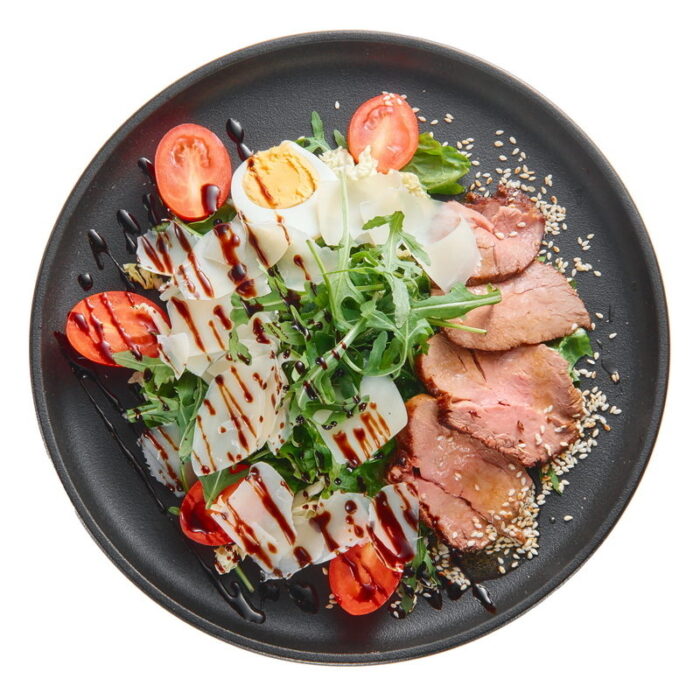 Сочные ломтики маринованного ростбифа дополняют свежую рукколу, салатный микс, помидорки черри, маринованное яйцо, с тертым сыром пармезан и кунжутом. Медово-горчичная заправка добавляет пикантности, а бальзамический соус завершает вкус.