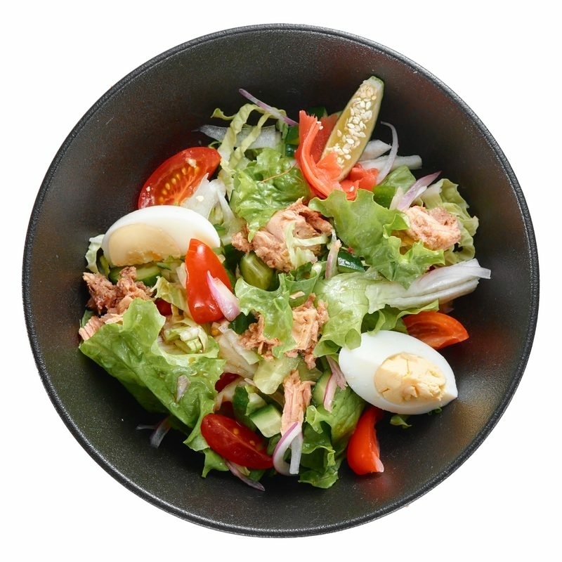Салат с консервированным тунцом в сочетании с свежим огурцом, болгарским перцем, помидорками черри, красным луком , яйцом и сочными листьями салата. А соево-лимонная заправка дополняет азиатскими нотками.