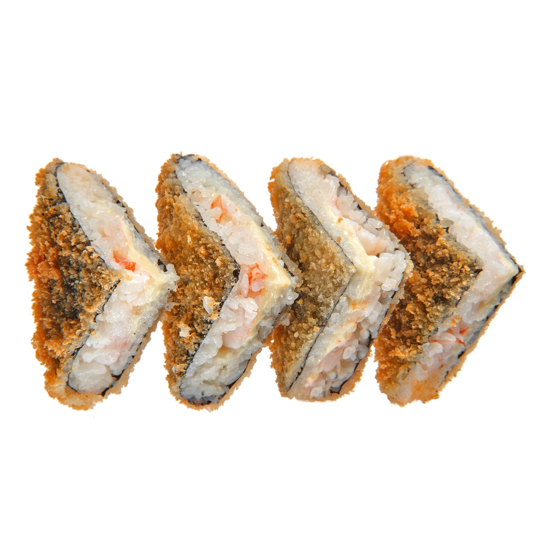 Японский сэндвич, обжаренный во фритюре, с креветками, заправленным рисом, сыром чеддер и соусом сладкий чили. Подаётся сэндвич с имбирём, васаби и соевым соусом .