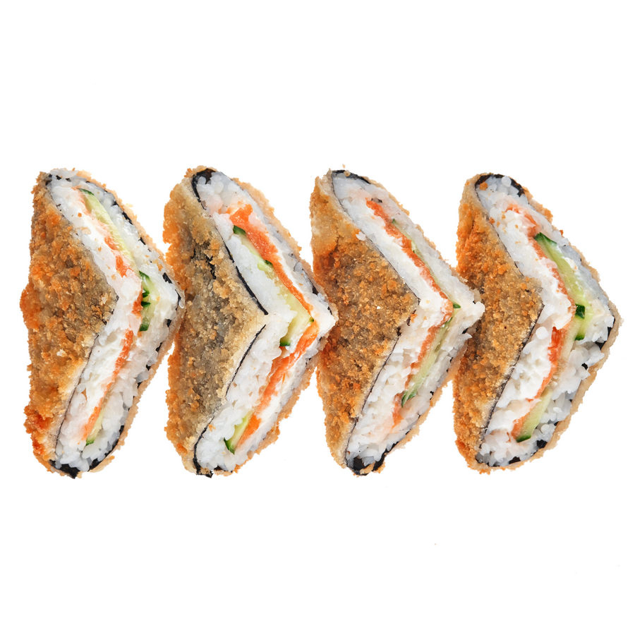 Японский сэндвич, обжаренный во фритюре, с лососем, заправленным рисом, сыром филадельфия и свежим огурцом. Для пикантности в блюдо добавлен соус спайси. Подаётся сэндвич с имбирём, васаби и соевым соусом .