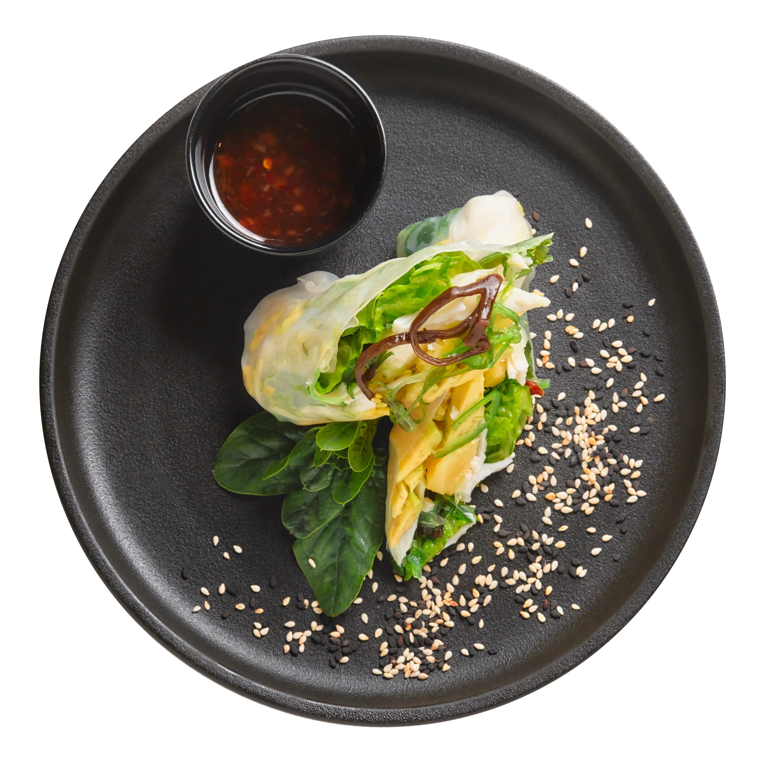 Традиционная лёгкая закуска для Китая в виде рулетиков из рисовой бумаги, с начинкой из мяса краба сурими, водорослей чука, кусочков ананаса, хрустящего листа салата и авокадо.