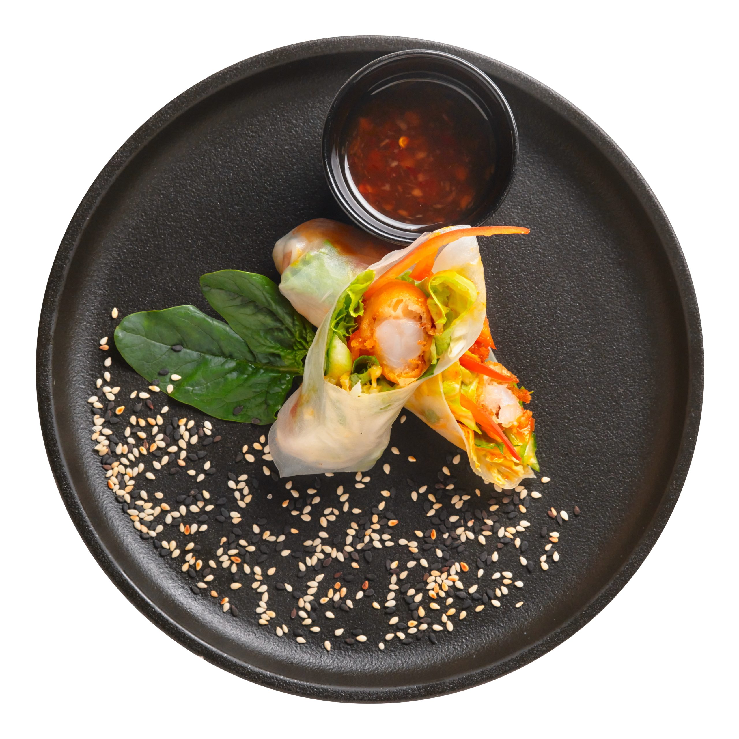Традиционная закуска для Китая в виде рулетиков из рисовой бумаги, с начинкой из креветок в воздушной темпуре, свежего огурца, авокадо, миксом из листа салата, рукколы, кинзы, шпината и соусом манго сальса .