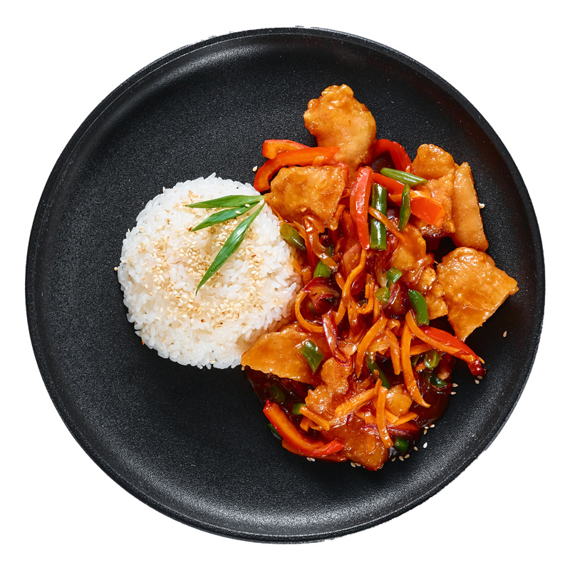 Классическое блюдо китайской кухни, которое сочетает в себе кусочки свинины, обжаренные до золотистой корочки, в кисло-сладком соусе с кусочками ананаса, зелёной фасолью, сладким болгарским перцем и свежей морковью. Подаётся с заправленным рисом, зелёным луком и кунжутом.