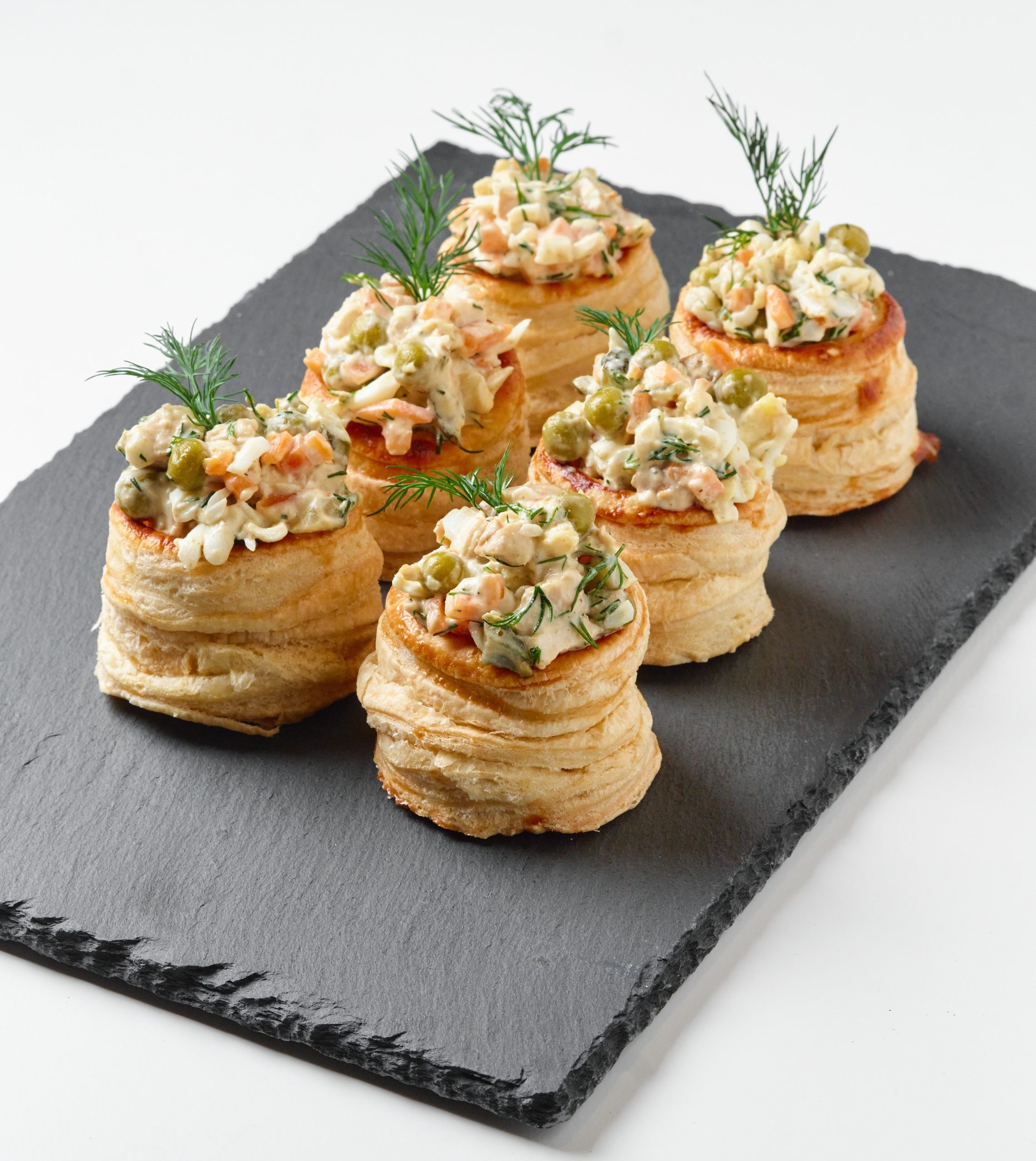 Тарталетки с салатом из мяса снежного краба — сурими, консервированной кукурузы, отварной моркови , яйца и майнеза. Комплект 6 штук.