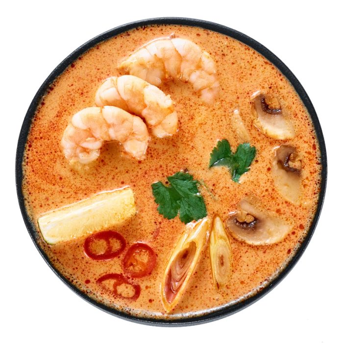 Кисло- острый тайский суп на основе куриного бульона с добавлением кокосового молока и сливок, с креветками свежими шампиньонами, томатами черри, перчиком чили, лаймом и зеленью ( кинза и зелёный лук). Подается с заправленным рисом и мягкими паровыми булочками. Вес блюда прописан с учётом всех ингридиентов и булочек.