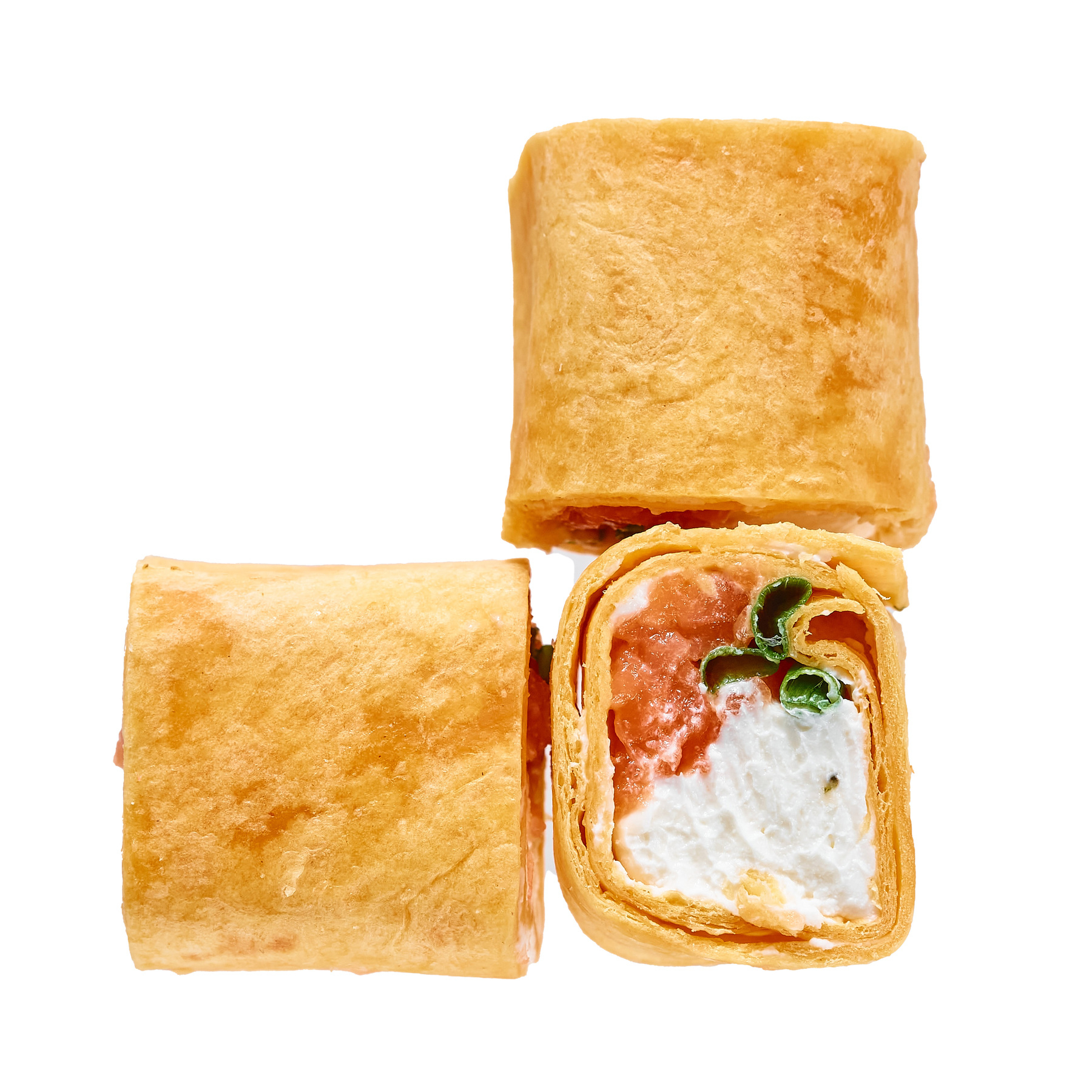 Филе лосося в сочетании с свежим огурцом, зелёным луком и сливочным сыром завёрнутые в пшеничную лепёшку. Блюдо подаётся с имбирём, васаби и соевым соусом. В порции 8 штук
