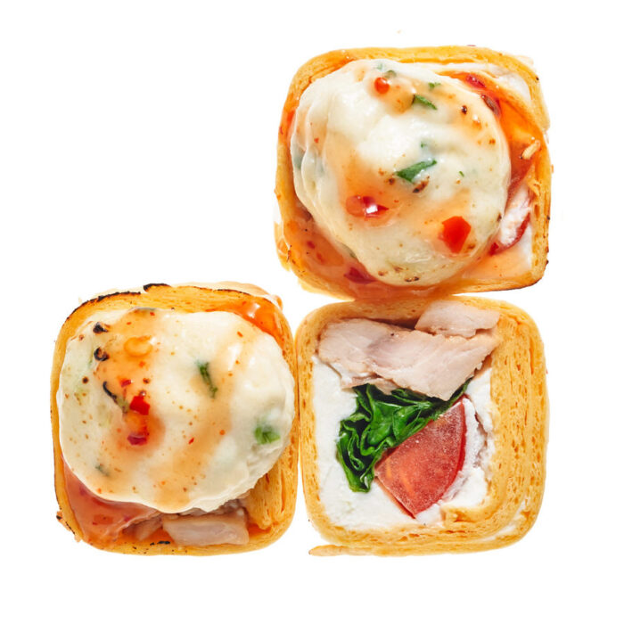 Сочетание сливочного сыра, помидорок черри, листа салата и куриного филе в пшеничной лепёшке. Ролл запекается под сырной шапочкой и украшается соусом сладкий чили. Блюдо подаётся в комплекте с имбирём, соевым соусом и васаби. В порций 8 штук.