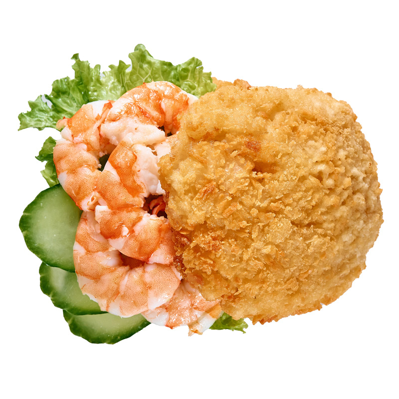 Булочка из риса и нори обжаренная во фритюре с начинкой из сочных креветок, листа салата, свежего огурца, соуса мацахиро и спайси .